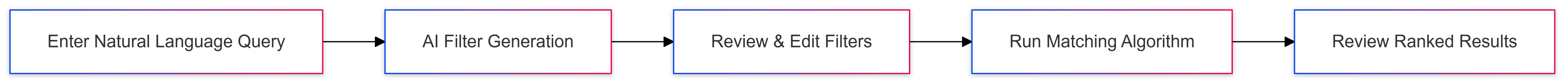 - Basic Flow: Describe needs → AI creates filters → Review → Match → Results