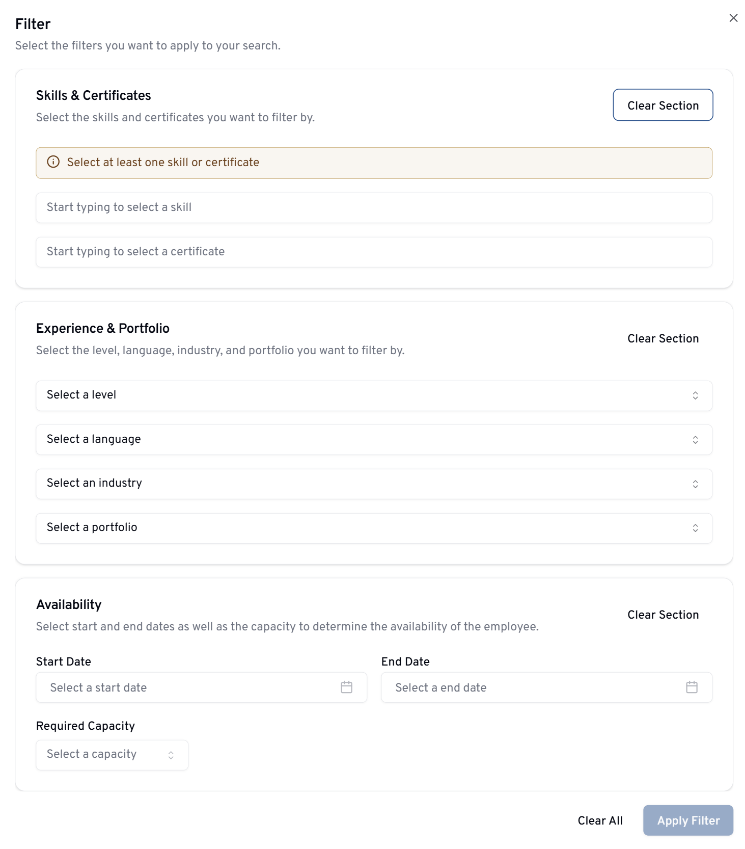 - Available Filters: Skills, Certifications, Portfolios, Industry, Level, Languages, Availability