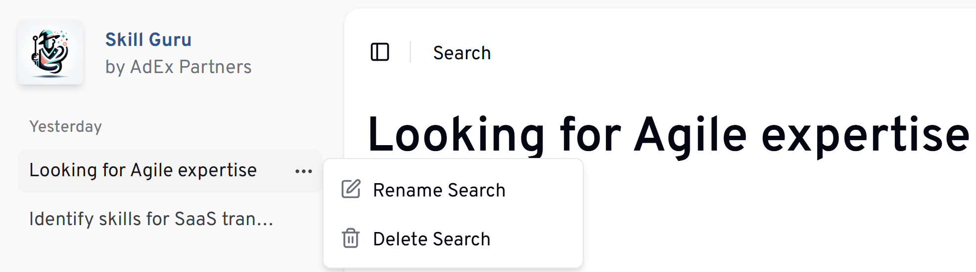 - Rename: Hover and click on search name to rename, or use three-dots menu in sidebar